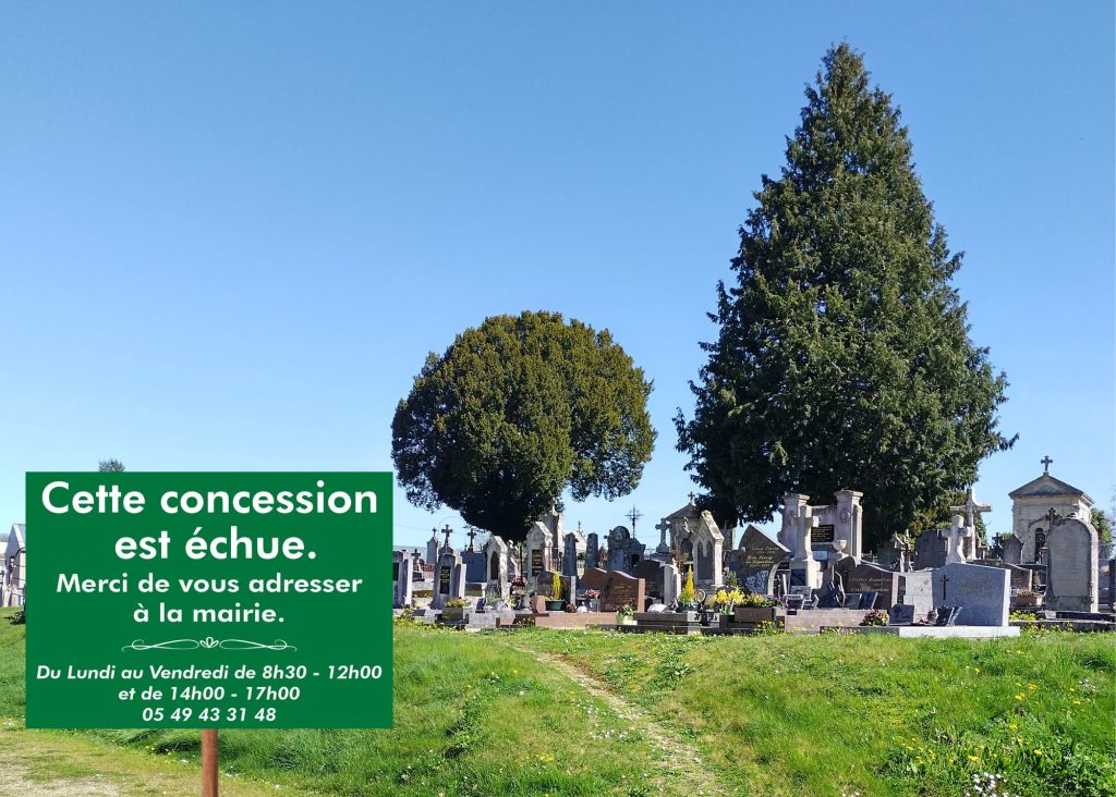 - Identification des concessions : une pancarte est apposée sur chaque tombe concernée, indiquant que la concession est échue ou arrive à échéance et que le concessionnaire ou les ayants droit doivent se manifester en mairie,